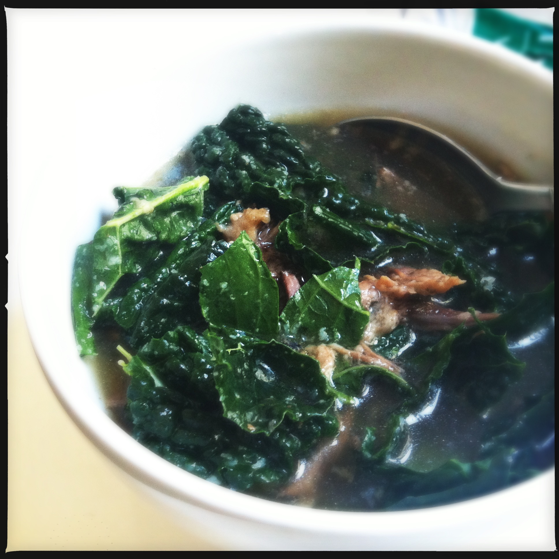 As I’m increasing my training I’m putting more emphasis on having joint protective nutrients in my diet. Here’s a batch of absolutely delicious beef bone broth that I had simmering away in the slow cooker for 24hours (beef bones, a carrot choped in half, an onion quatered, a teaspoon or two of whole peppercorns and 3 or 4 bay leaves). Today I served it for lunch with the small bits of meat that were on the bone and some fresh cavolo nero (no need to cook to cavolo nero – just rip it / chop it and pop it into a bowl of hot broth) and seasoned with sea salt. Great for this cool weather.